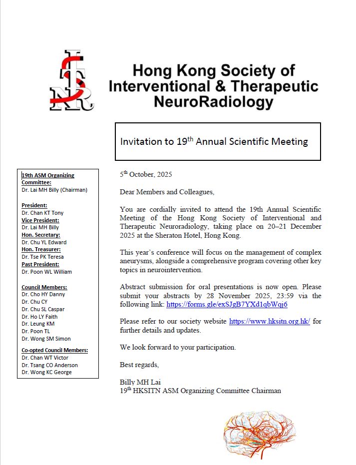 Asian-Australasian Federation of Interventional and Therapeutic Neuroradiology (AAFITN) was founded in 1994 by Professor Ling Feng. The last 5th Congress was held in Hong Kong with the late Prof. John Ching-Kwong Kwok (2002 - Hong Kong). The 15th AAFITN Biennial Congress will be in Hong Kong 13rd to 15th October, 2023, 21 years after the last.